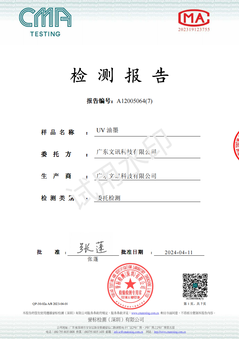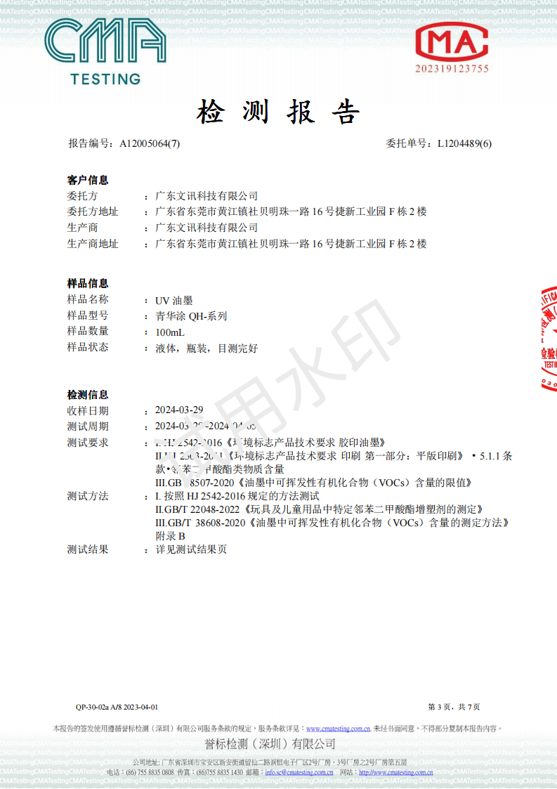青华涂UV油墨 环境标志2024 检测报告