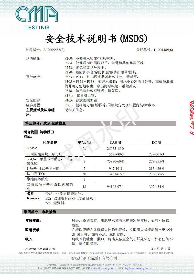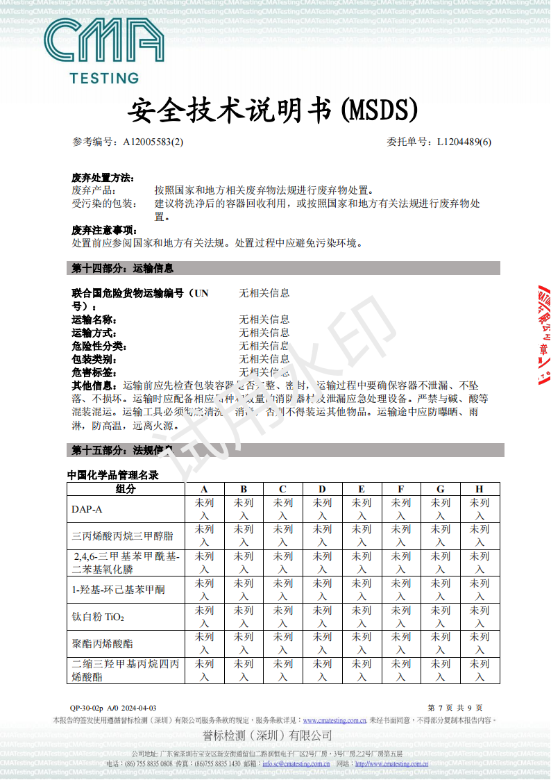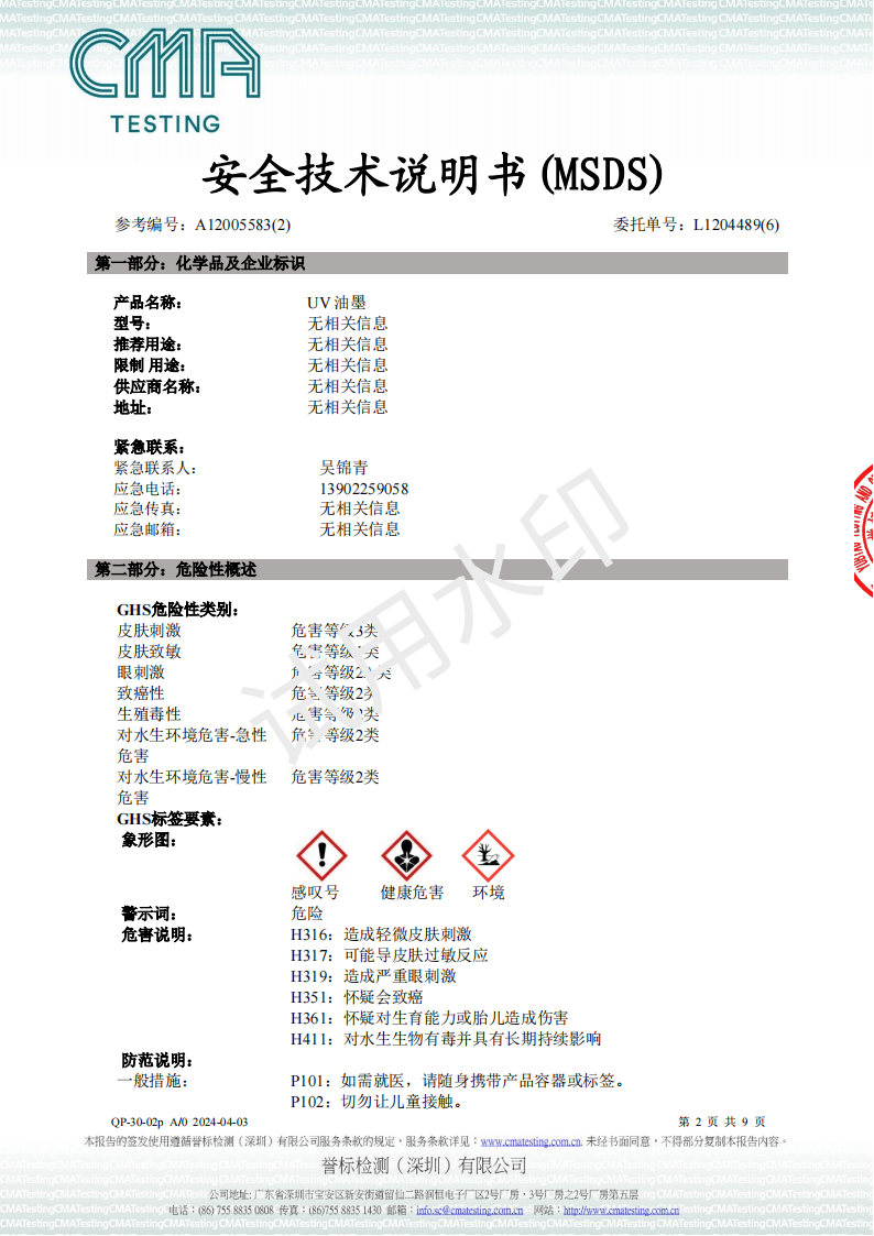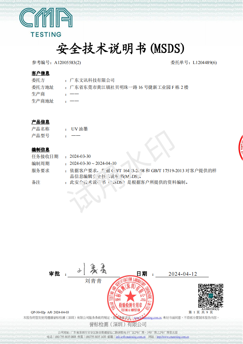 UV油墨MSDS-2024检测报告