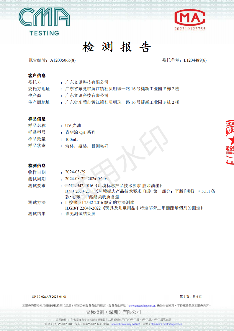 UV光油 环境标志 2024检测报告